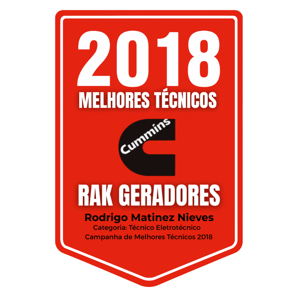 A RAK Geradores tem em sua equipe um técnico premiado como o Melhor Eletrotécnico do Brasil pela Cummins, em 2018 — uma das maiores fabricantes de motores e geradores do mundo.